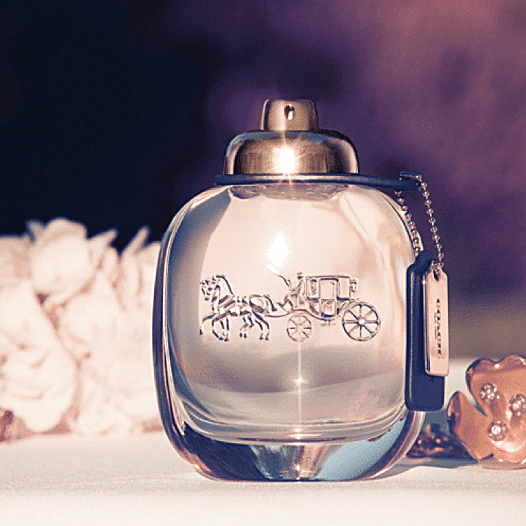 The solid glass bottle references the signature Coach design details: a leather tag hangs from its side, the iconic turn-lock Coach handbag closure is turned into an atomizer, and the horse and carriage emblem is engraved in the glass of the bottle.